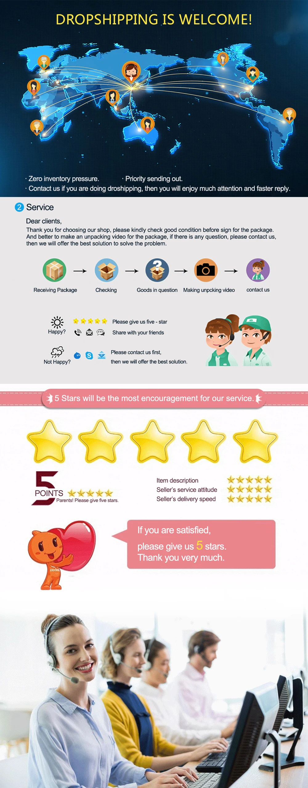 We will send the order as soon as possible, normally in 1-3 working days, and if you need any help, please feel free contact us, we are always here for you. As we cooperate with the factory, so we can offer the best price , we welcome dropshipping, the Minimum quantity is 20 pieces.Besides, we declare low price for the package, but if it is inspected by the customs, and you still need to pay the tax, please kindly note, thanks.